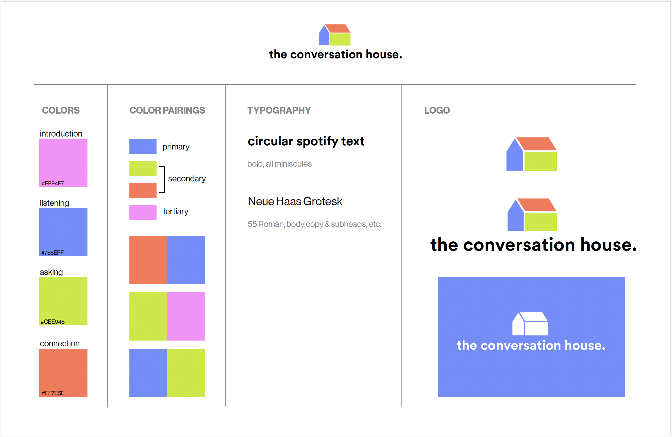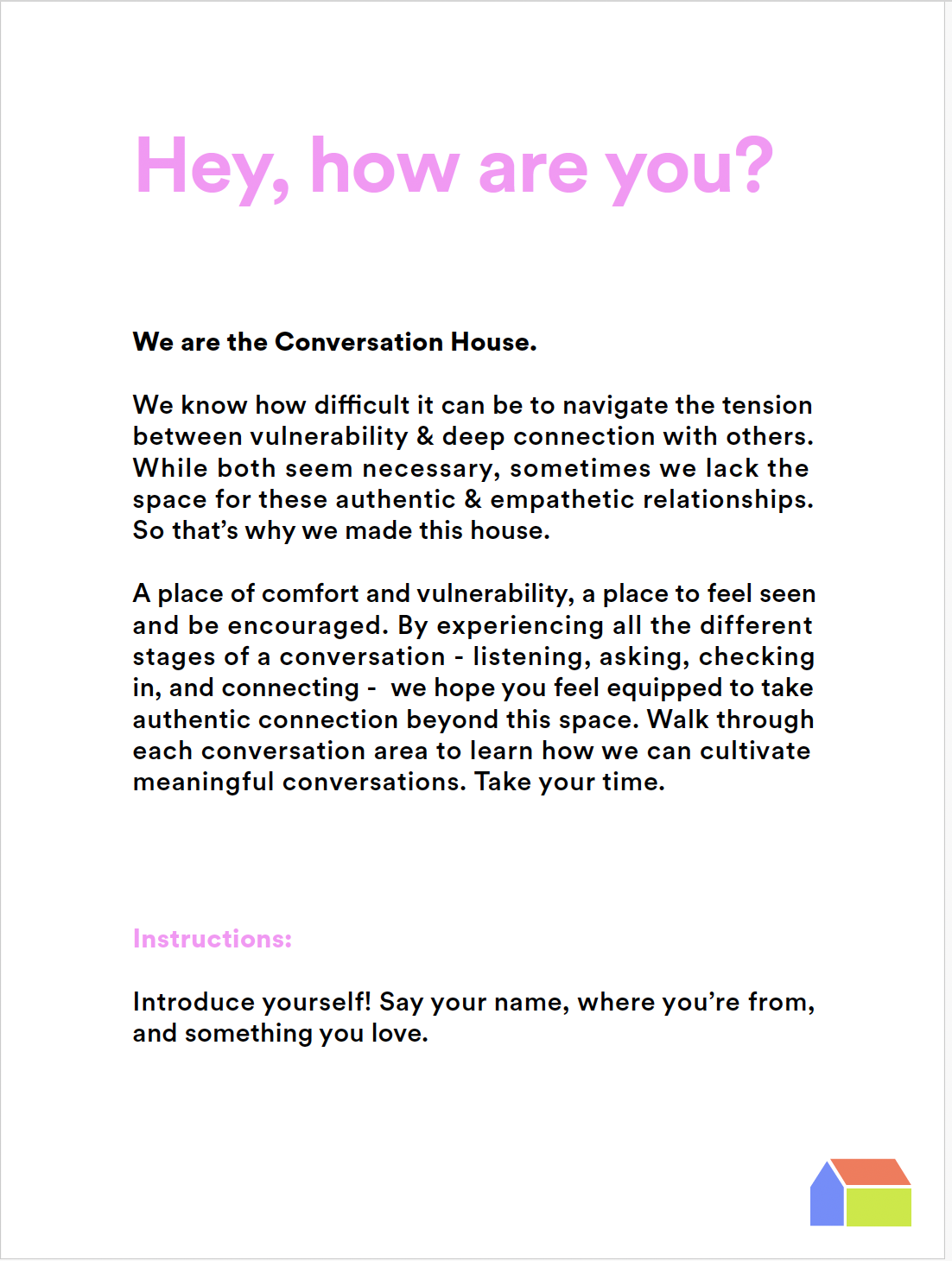 The first major hurdle was figuring out what type of experience this would be. I offered that if the entire intention was to have people come and chat, why not revolve the experience around the steps of a conversation.